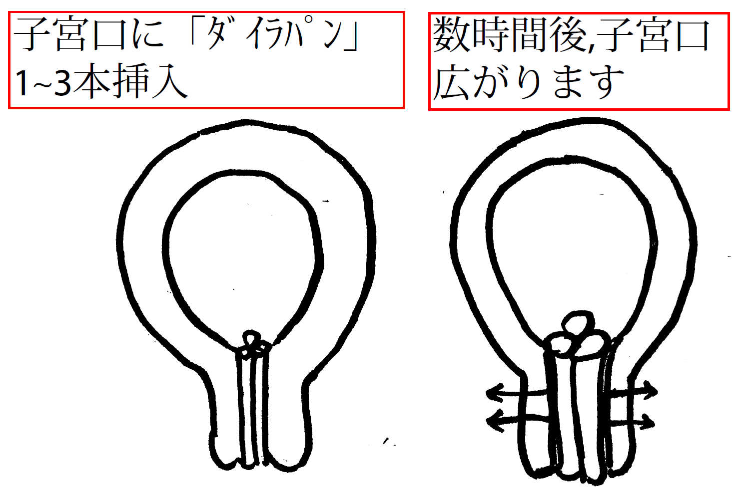 ①前日又は当日の朝に、まず子宮口にラミナリア又はダイラパンを1~3本入れ子宮口を広げます。挿入されたラミナリアやダイラパンは周囲から水分を吸収して子宮口の中で膨張し、半日~1日で子宮口が広がります。それから