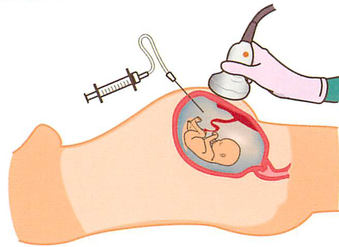 妊娠18~19週に、超音波で子宮の中を観察しながら、腹壁から針を刺し羊水を20ml程度採取します。