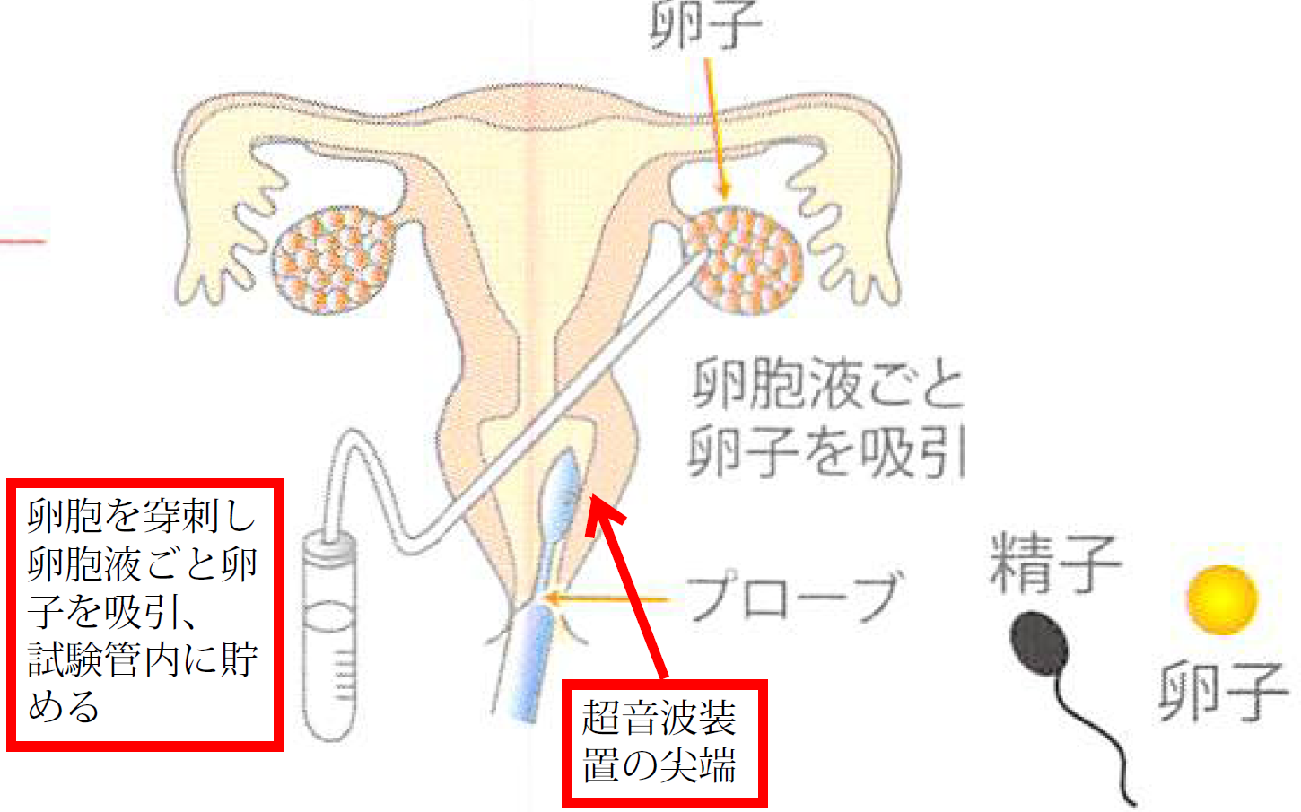 卵胞が発育して、卵胞径が18㎜位になったら、経膣超音波で卵巣を観察しつつ、長い注射針を用いて、膣壁から卵巣内の卵胞を目がけて刺して卵を採取します。