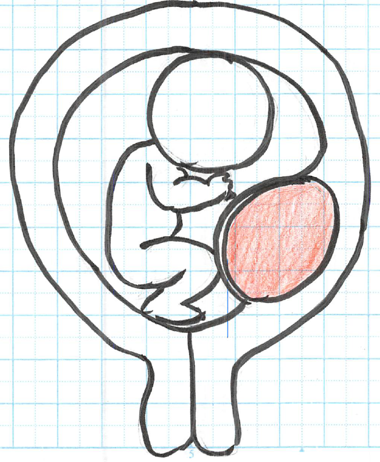 ・下図の様に、筋腫核の上に胎盤が付着していると、妊娠中に胎盤早期剥離が起こる事があります。