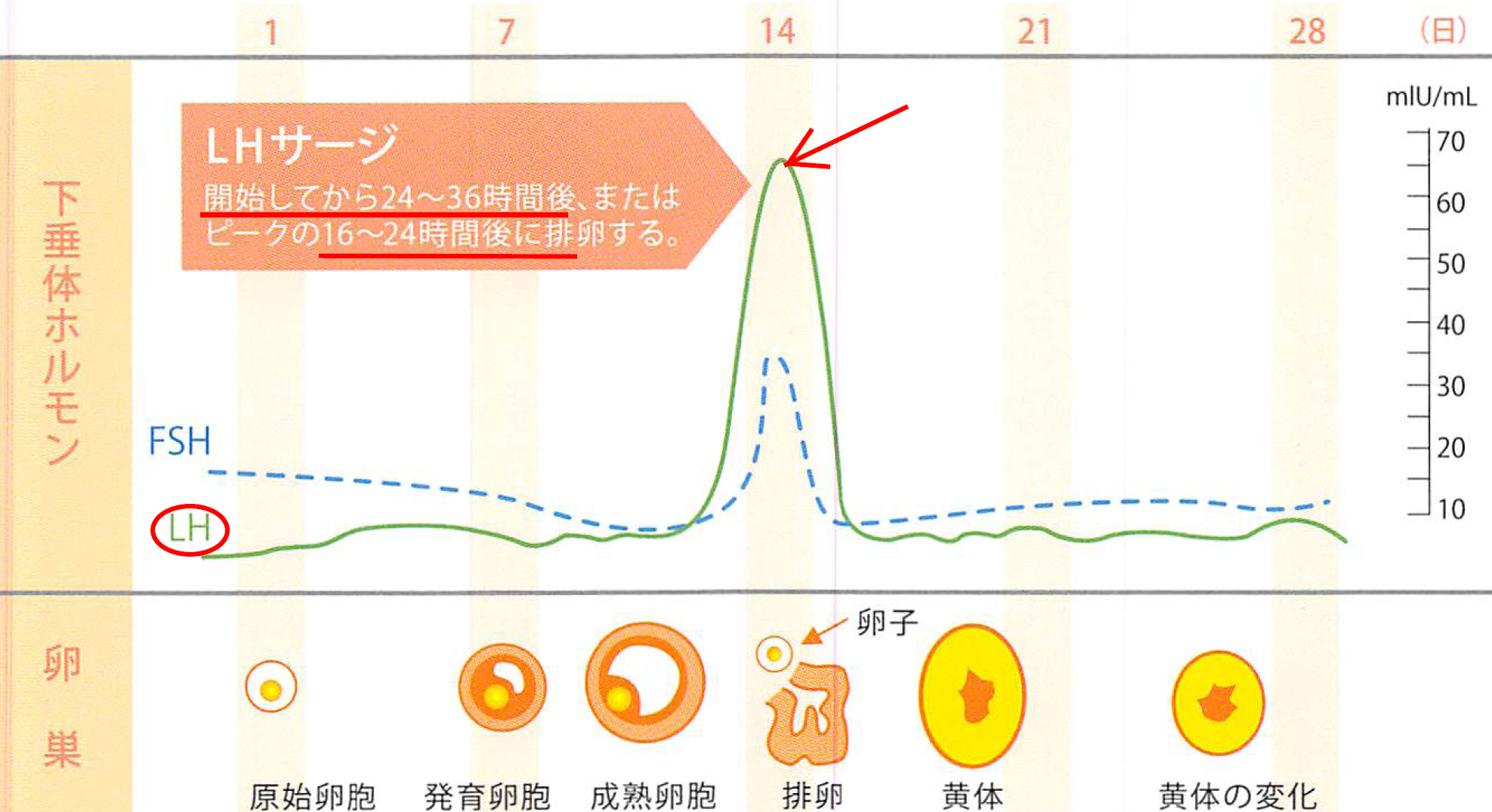 ★排卵の直前になるとLH(卵巣刺激ホルモン)が一時的の多量に分泌されます。尿中にもLHが出てきます。