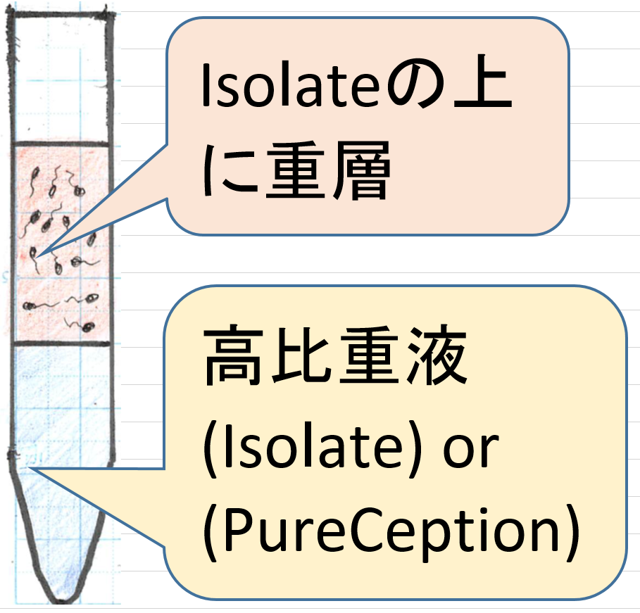 (2)試験管底に高比重の90%Isolate又は90%PureCeption又は90%Sil-Selectを4~6㎖入れます。(3)その上に、精液の希釈液を重層し2層にします。