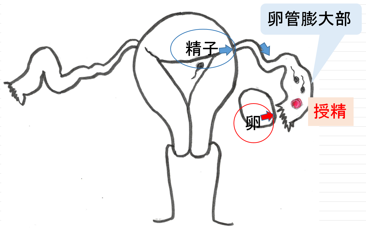 子宮内の入った精子は、卵管内に侵入し、卵管の先端の少し広くなった場所(卵管膨大部)に到達し、そこで排卵された卵に授精します。