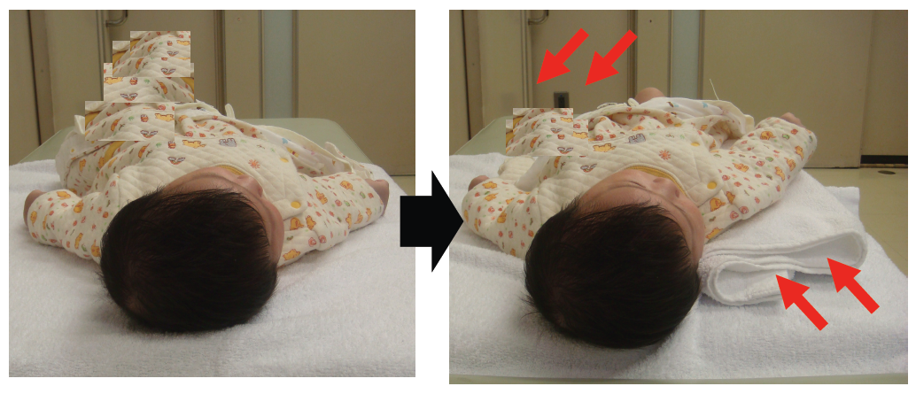 ★向き癖のある側の頭から体まで(右ばかり向きやすい児では右の頭から体まで)バスタオルなどを差し込んで、少し持ち上げて反対側を向かせてみてください。