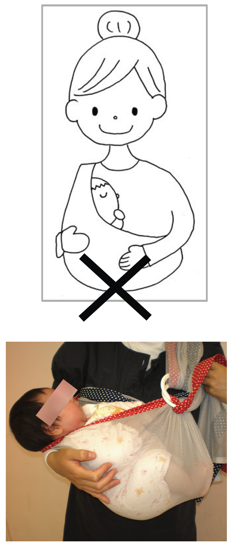 ✖✖「横抱きスリング」はM字型の開脚の姿勢が取れず、両足を伸ばしたままになるので良くないです。