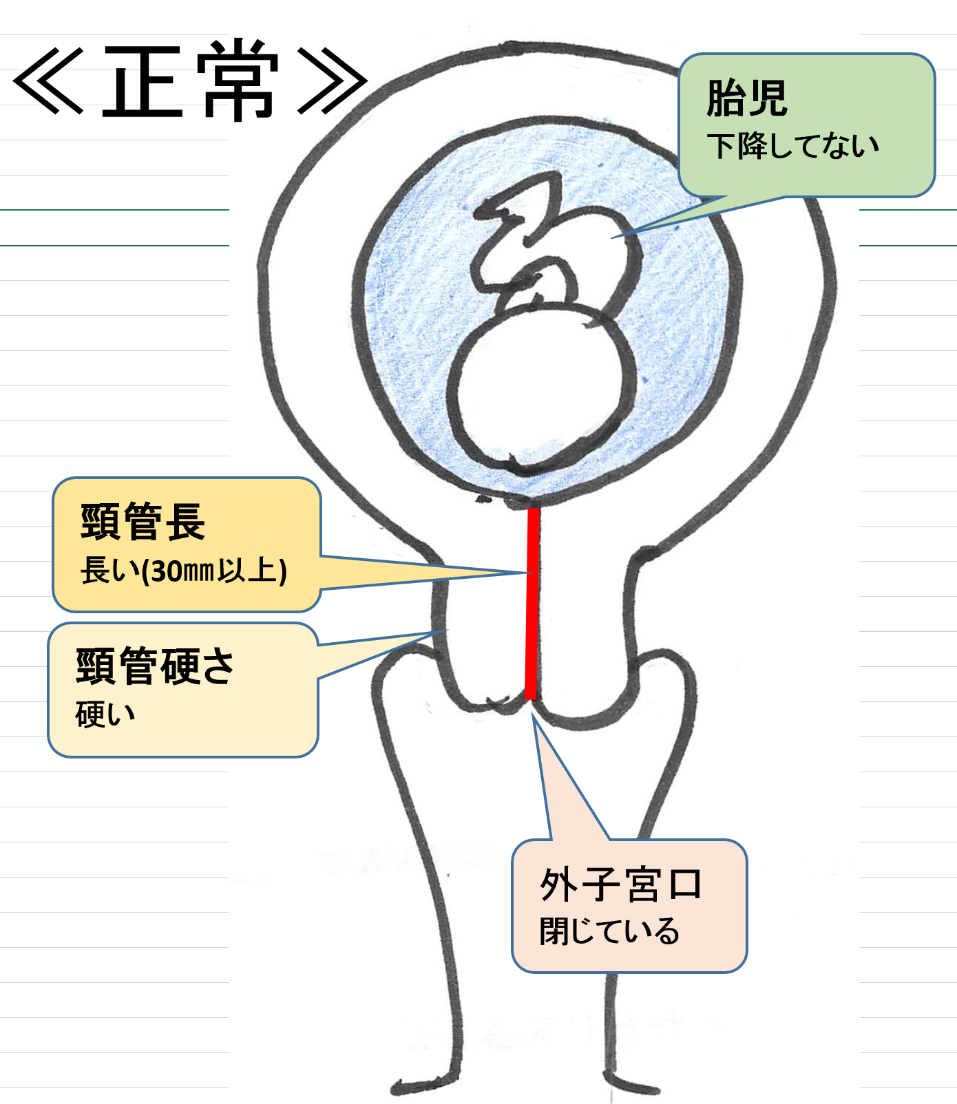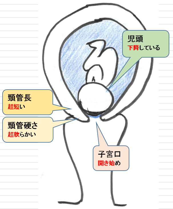 ★上図では、子宮口が1㎝位開大、頸管長も20㎜以下と非常に短縮、頸管は軟化、児頭が下降しているので、かなり早産し易いです。すぐに入院し早産予防の点滴が必要です。
