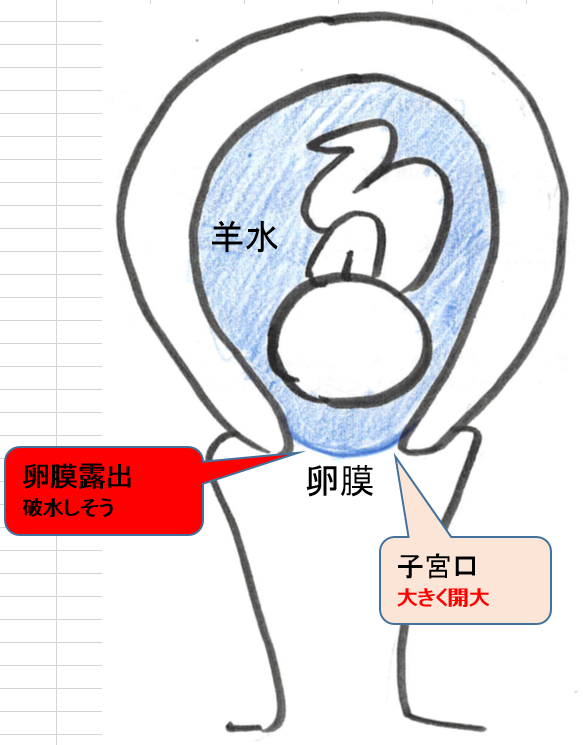 ★子宮口が大きく開いて卵膜が露出しているので、卵膜が破れやて破水しそうです。